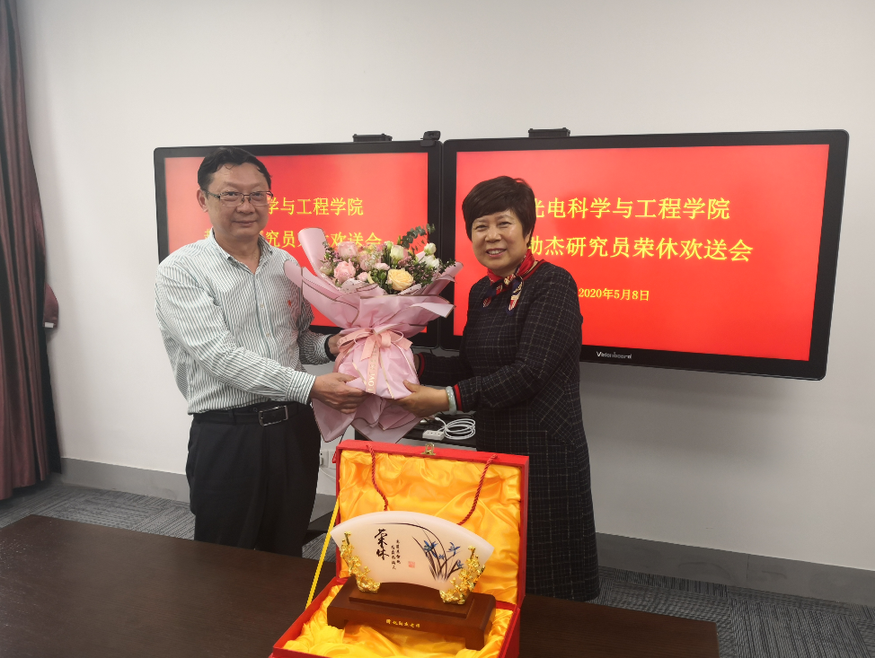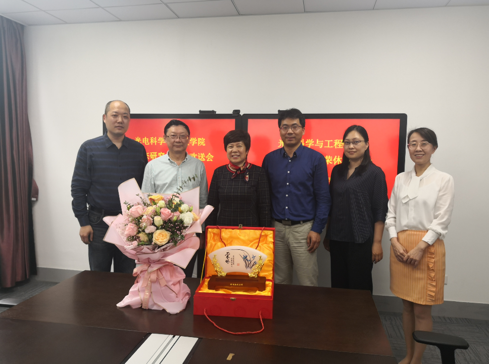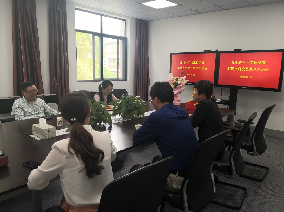 5月8日下午,91直播 为2020年度退休的教职工举行荣休欢送会,这也是光电学院首次为退休教职员工举行荣休仪式。学院2020年退休教职工赵勋杰研究员,院党委书记陈建军、院长李孝峰等学院领导,学院分工会主席,教职工代表等参加了此次活动。