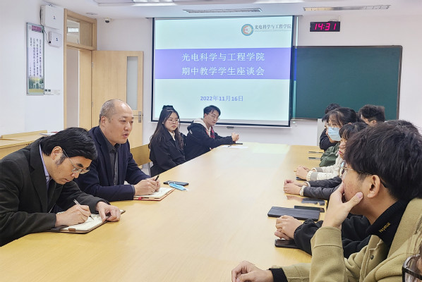 2022年11月16日下午14:30,91直播 在博远楼207先后召开了期中教学学生座谈会和教师座谈会。校教学督导顾济华教授、院教学督导吴建宏教授、光电信息系主任李念强、本科实验教学中心兼电子测控系副主任张晓俊、学院教师代表、教务办公室老师及学生代表参加了座谈。会议由教学副院长许宜申主持。